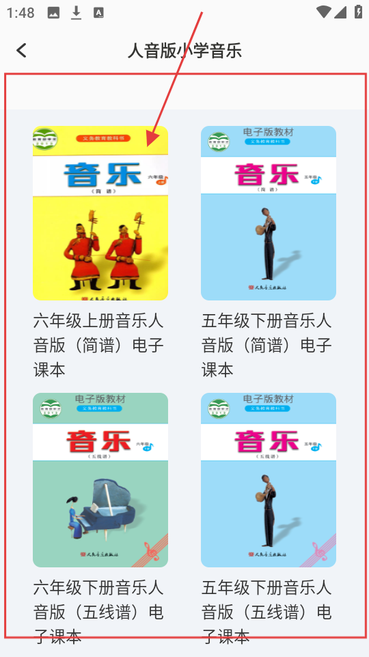 2、电子课本页有人音版小学音乐等课本,选对应年级和版本的课本,开启课本学习。