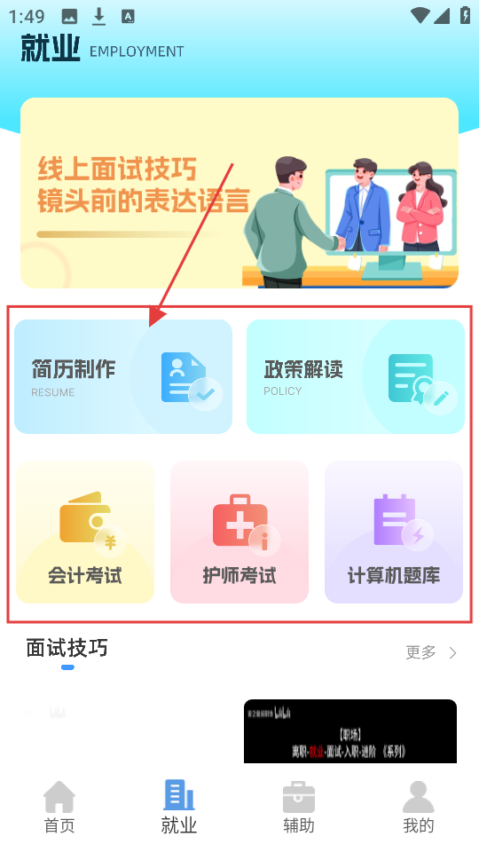 4、就业页有【简历制作】【政策解读】等功能,想做简历,点【简历制作】,助力就业准备。