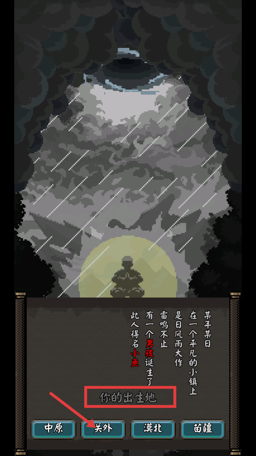 1、开局选择【关外】作为出生地,开启游戏旅程,不同出生地会影响后续探索的场景与剧情。