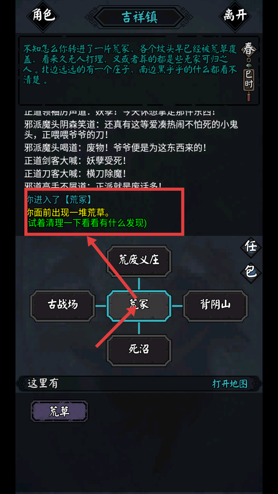 2、进入【荒冢】场景后,面对眼前的荒草,选择清理操作,探索可能隐藏的物品或线索。