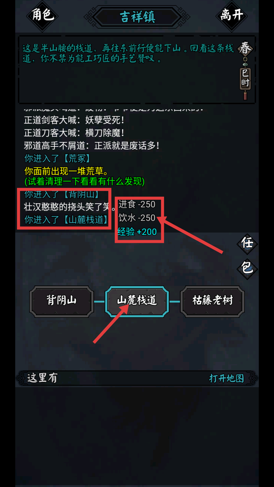 3、前往【山麓栈道】,过程中会消耗进食、饮水各250,但能获得200经验,注意资源与经验的变化。