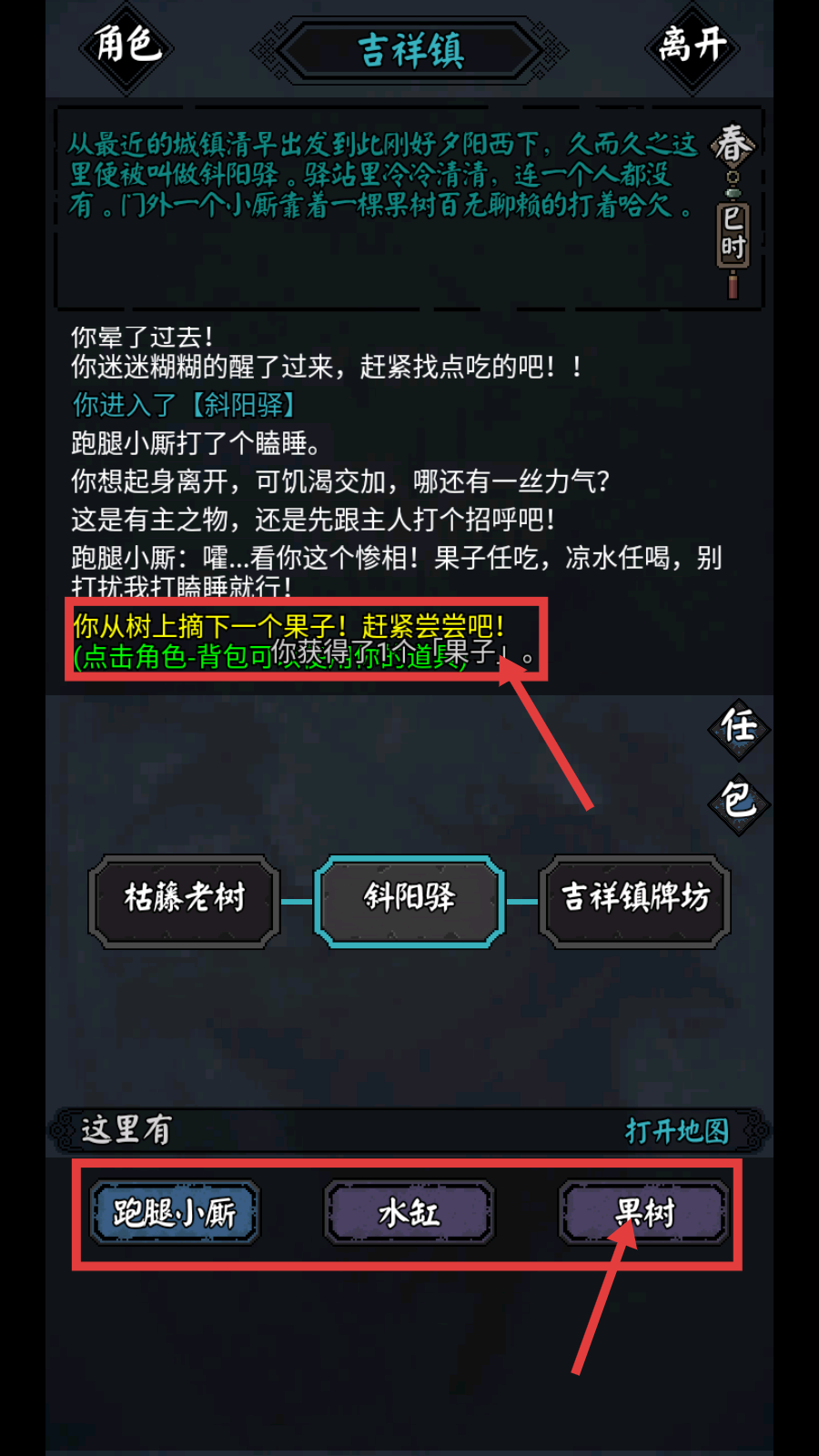 4、到达【斜阳驿】,点击【果树】可摘下果子,还能通过角色背包查看获得的道具,补充资源。