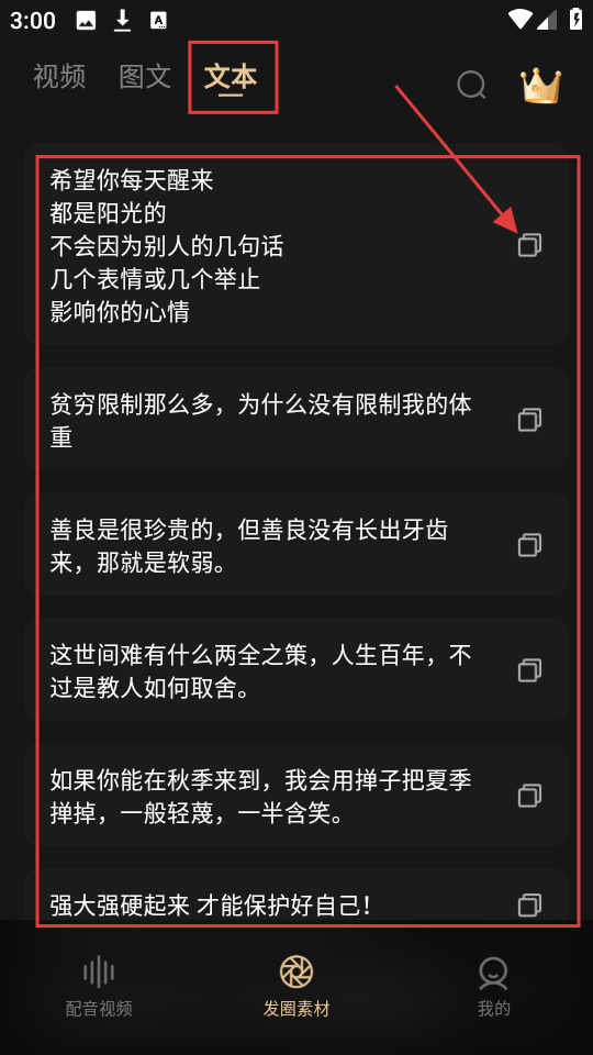 4、【文本】页有各种文字内容,喜欢的话,点右侧复制图标,就能复制文字啦。