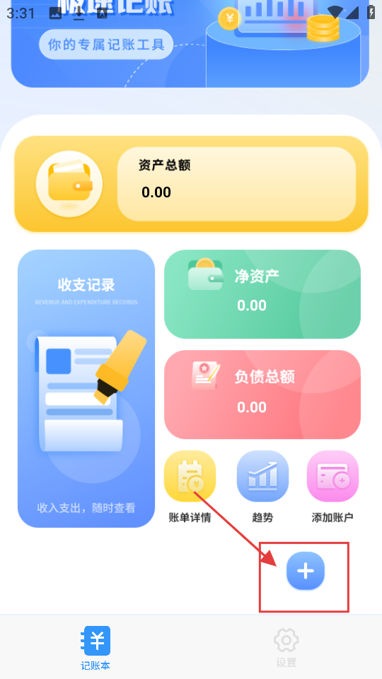 1、记账本首页有【+】按钮,想记账就点它,进入支出或收入记账页面,开始记账。