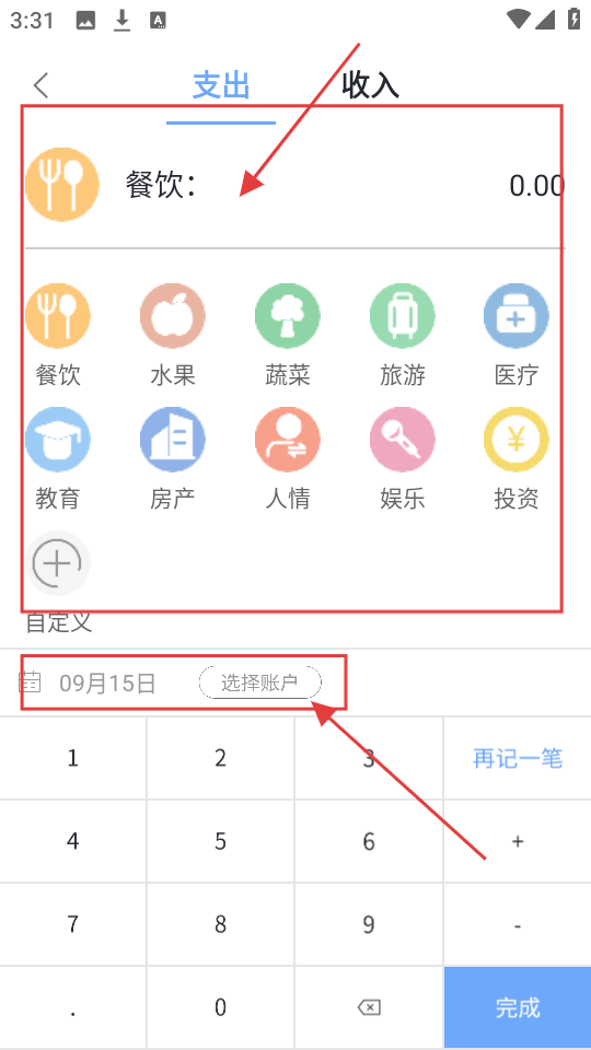 2、支出记账页有餐饮、水果等分类,选要记账的分类,再选账户,就能记录支出啦,超简单。