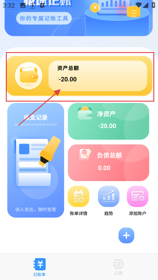 4、记完账,回到首页,能看到资产总额等变化,随时掌握财务情况,完成每日记账超有成就感的哦。