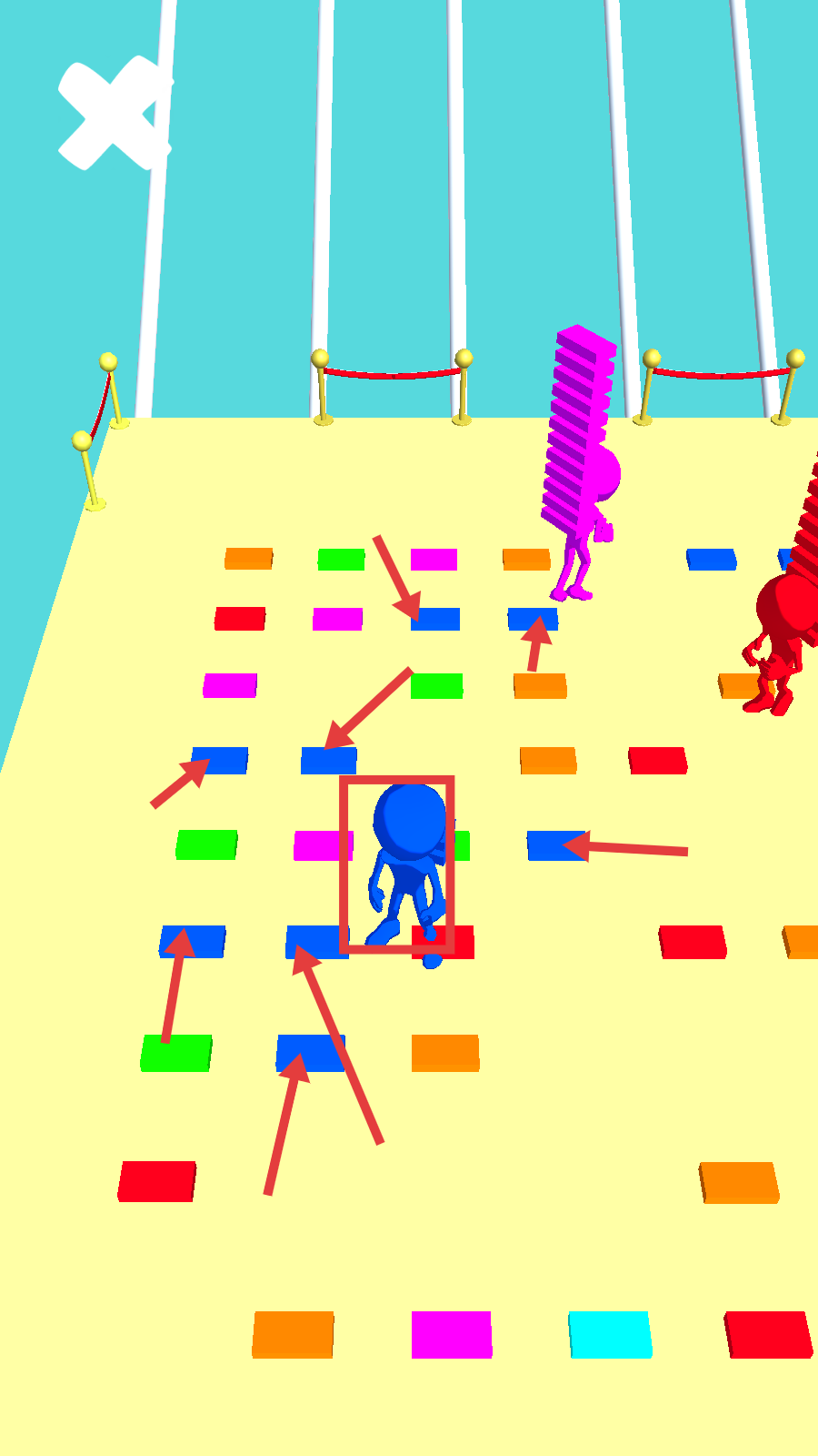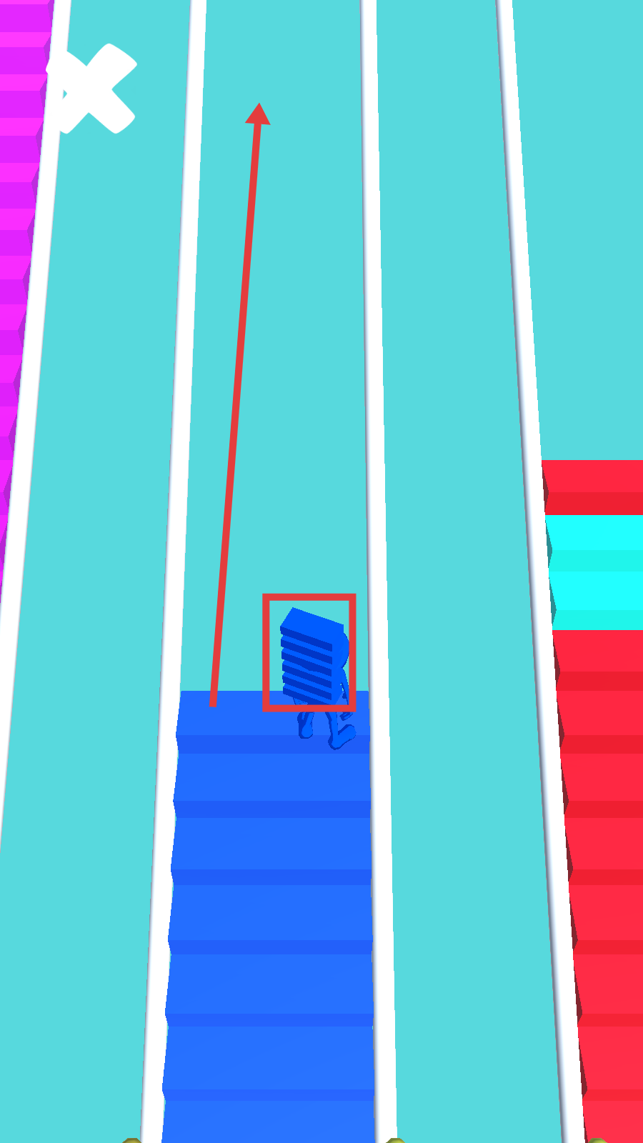 3、当收集足够方块后,沿着对应颜色的路径向上前进,借助收集的方块来搭建通道,助力通关。