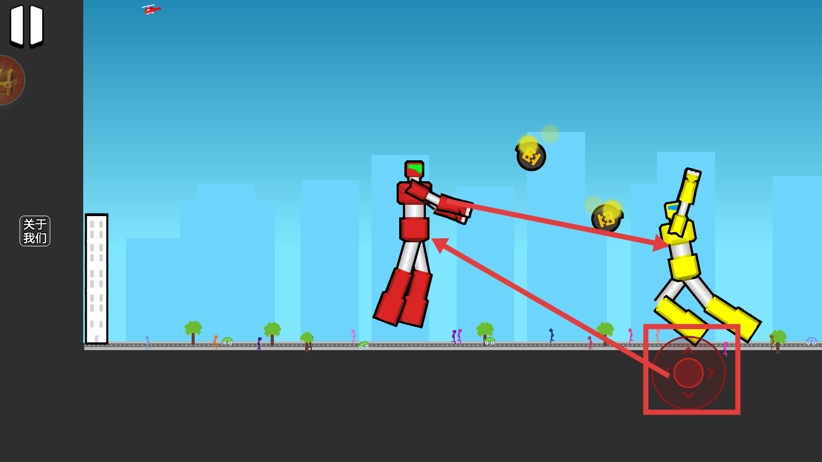 2、操控红色机器人时,利用右下角虚拟摇杆移动,发射道具攻击黄色机器人,灵活操作提升对战效果。