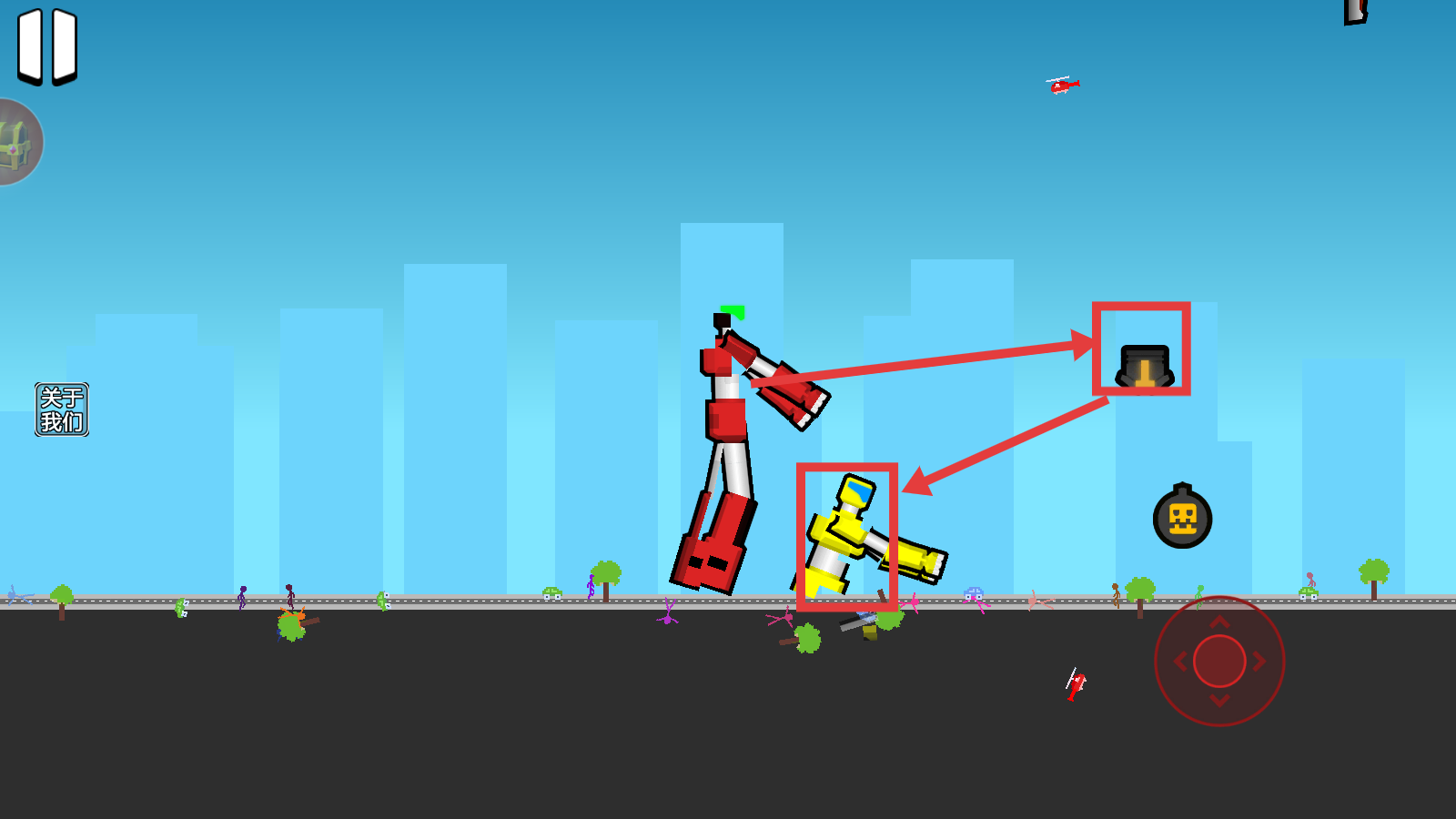 3、道具灵活运用:战斗中可拾取导弹和抓钩等道具,适时释放以增强攻击或限制对手行动,提升获胜几率并丰富战术选择。