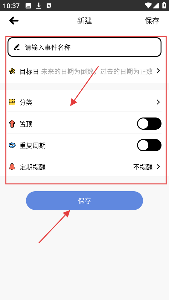 2、新建页面,输入事件名称,设置目标日、分类这些,都弄好后,点【保存】按钮。