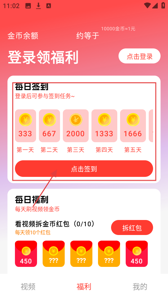 4、想领福利的话,在福利页面登录后点【点击签到】,能领每日签到金币,还有每日福利。