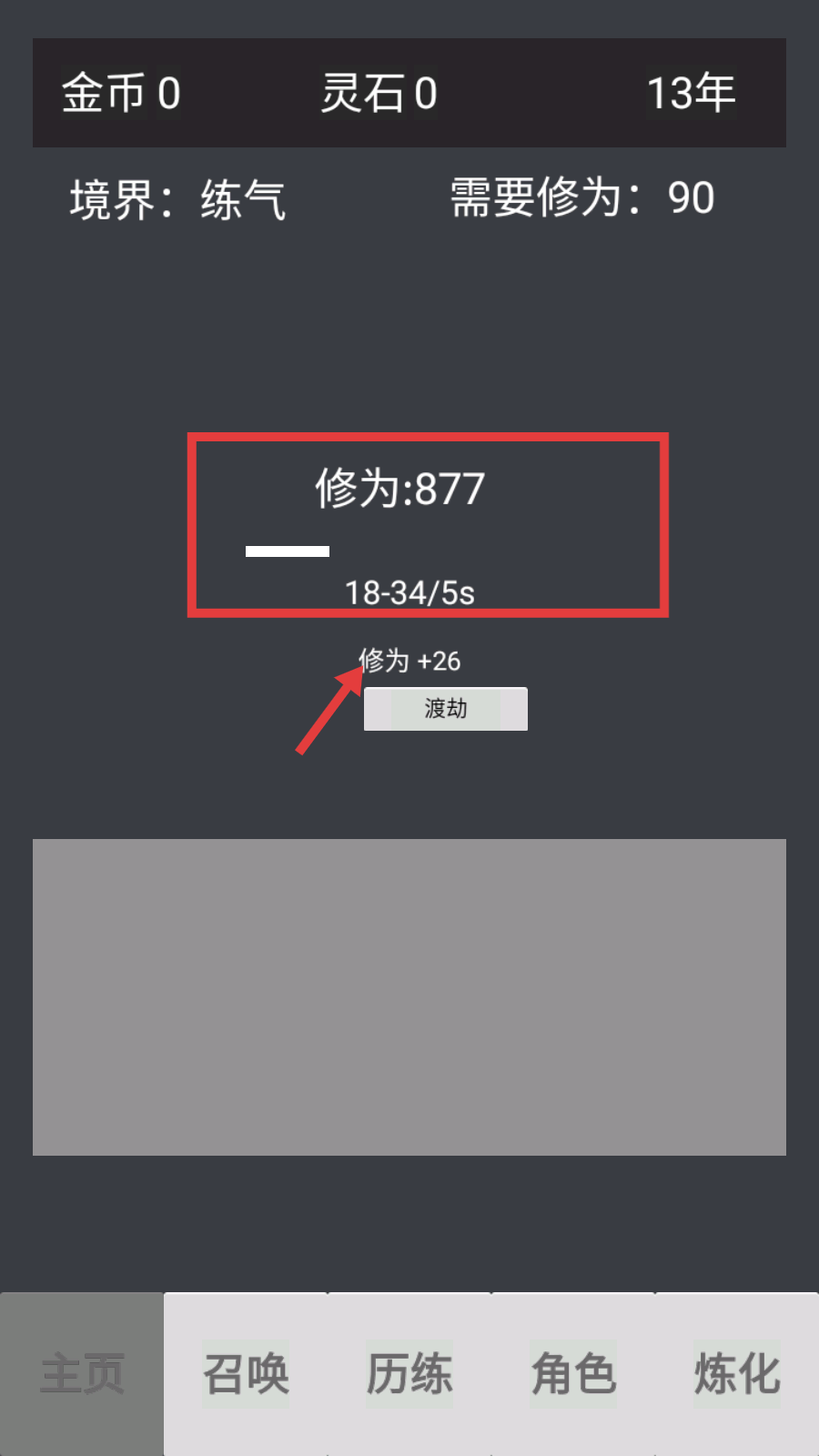 1、界面显示【修为:877】且自动增长【修为+26】,境界为【练气】,需积累修为至90,可先靠自动修炼提升。
