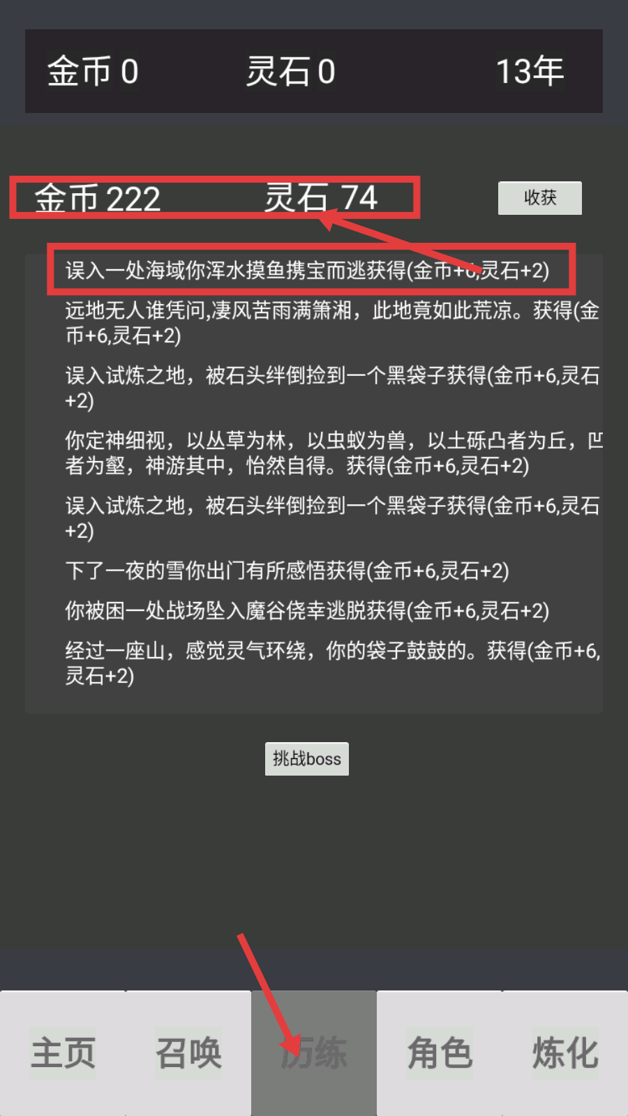 2、点击【历练】,会触发“误入海域浑水摸鱼”等事件,能获取【金币】【灵石】,积累资源助力修仙。