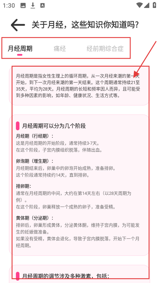 2、进入经期知识页面,能看到月经周期、痛经等分类,还有超详细的月经周期知识讲解,超实用。