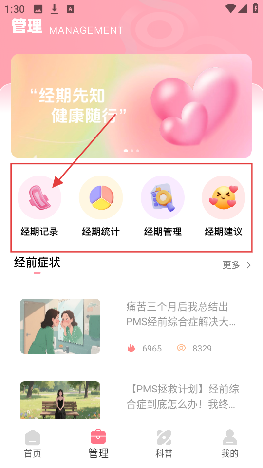 3、管理页面有【经期记录】【经期统计】等功能,想记录经期情况,点【经期记录】就可以啦。