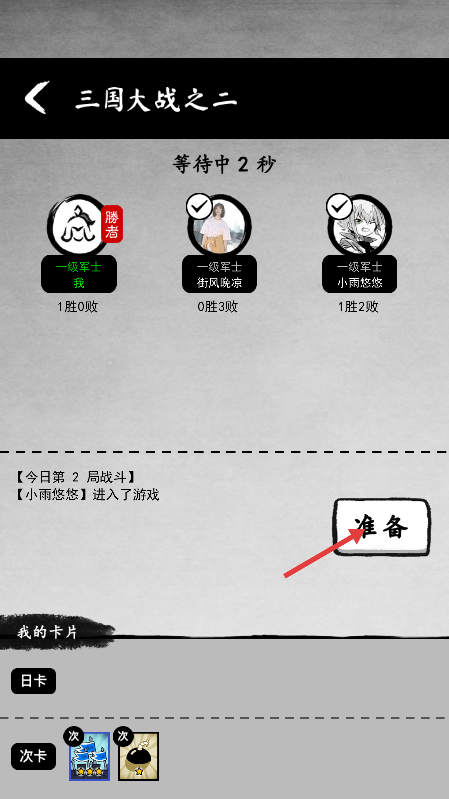 1、进入“三国大战之二”,匹配等待时点击【准备】,开启战斗流程。