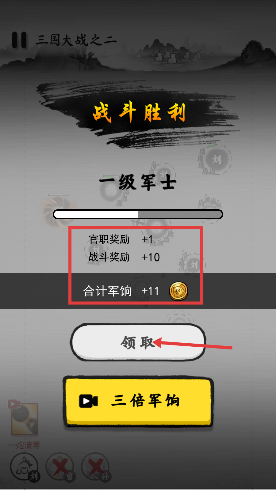 4、战斗胜利后,点击【领取】,可获得官职奖励+1、战斗奖励+10,合计军饷+11,积累资源提升实力。