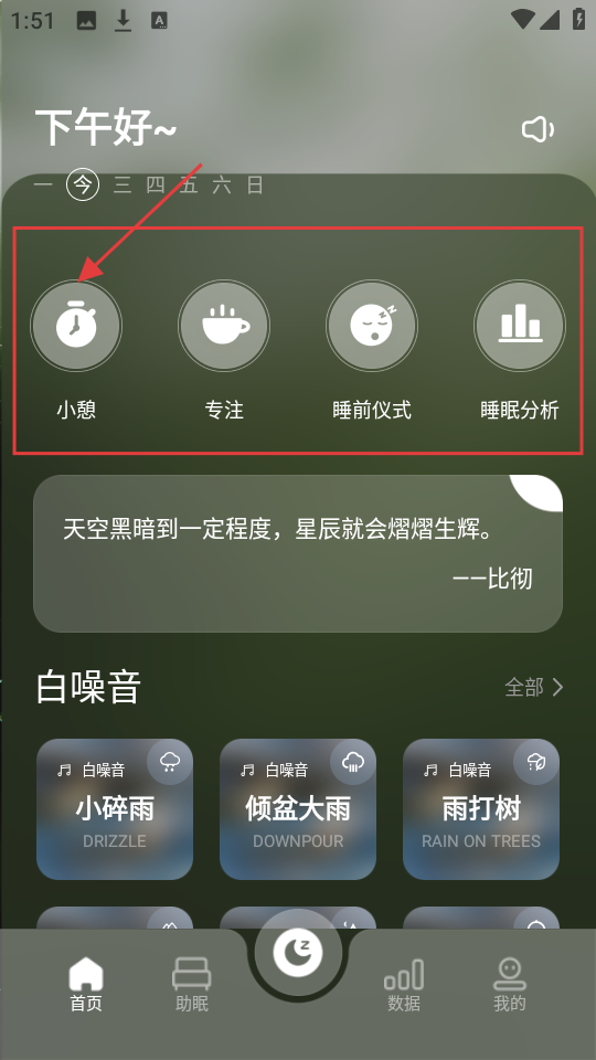 1、首页有【小憩】【专注】等功能,想短暂休息,点【小憩】就能进入相关页面啦。