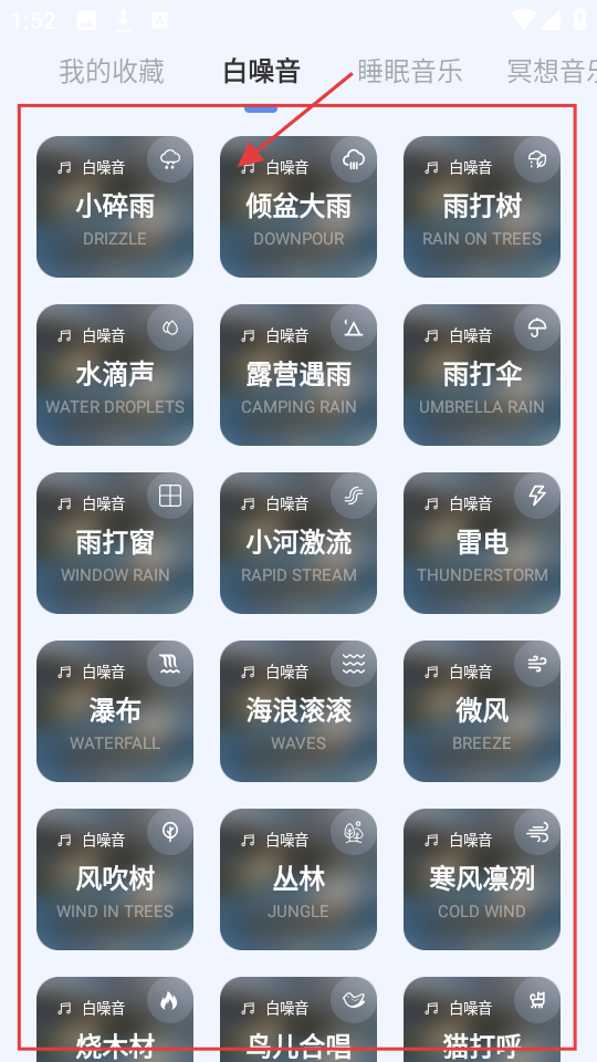 4、进入白噪音页面,有【小碎雨】【倾盆大雨】等超多白噪音,选喜欢的用超棒。