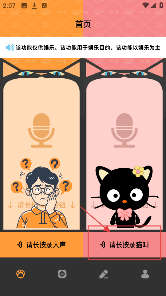 1、首页有录人声和录猫叫的功能,想和猫咪互动,长按对应的区域就行,超有趣。