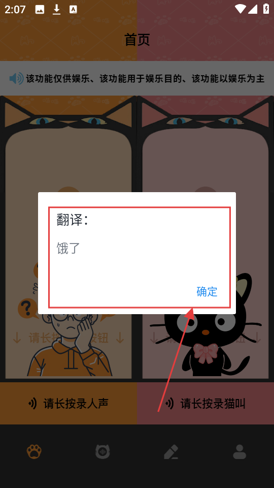 2、录完声音后,会弹出翻译结果,看看猫咪想表达啥,点【确定】就好啦。
