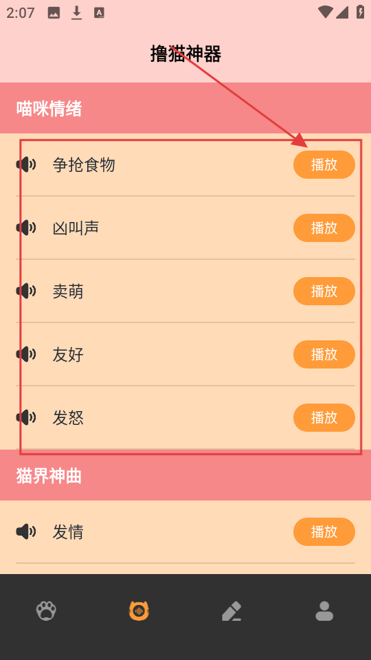 3、撸猫神器页面有猫咪不同情绪的声音,像争抢食物、凶叫声等,点【播放】听听。