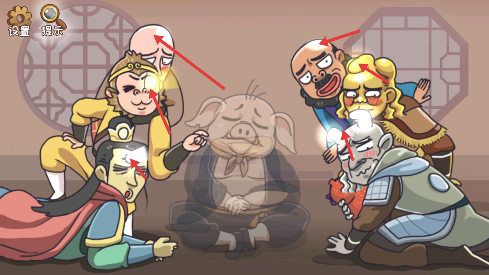 2、点击画面里悟空、唐僧等角色身上的发光点,收集这些光点,推进唤醒八戒的进程。