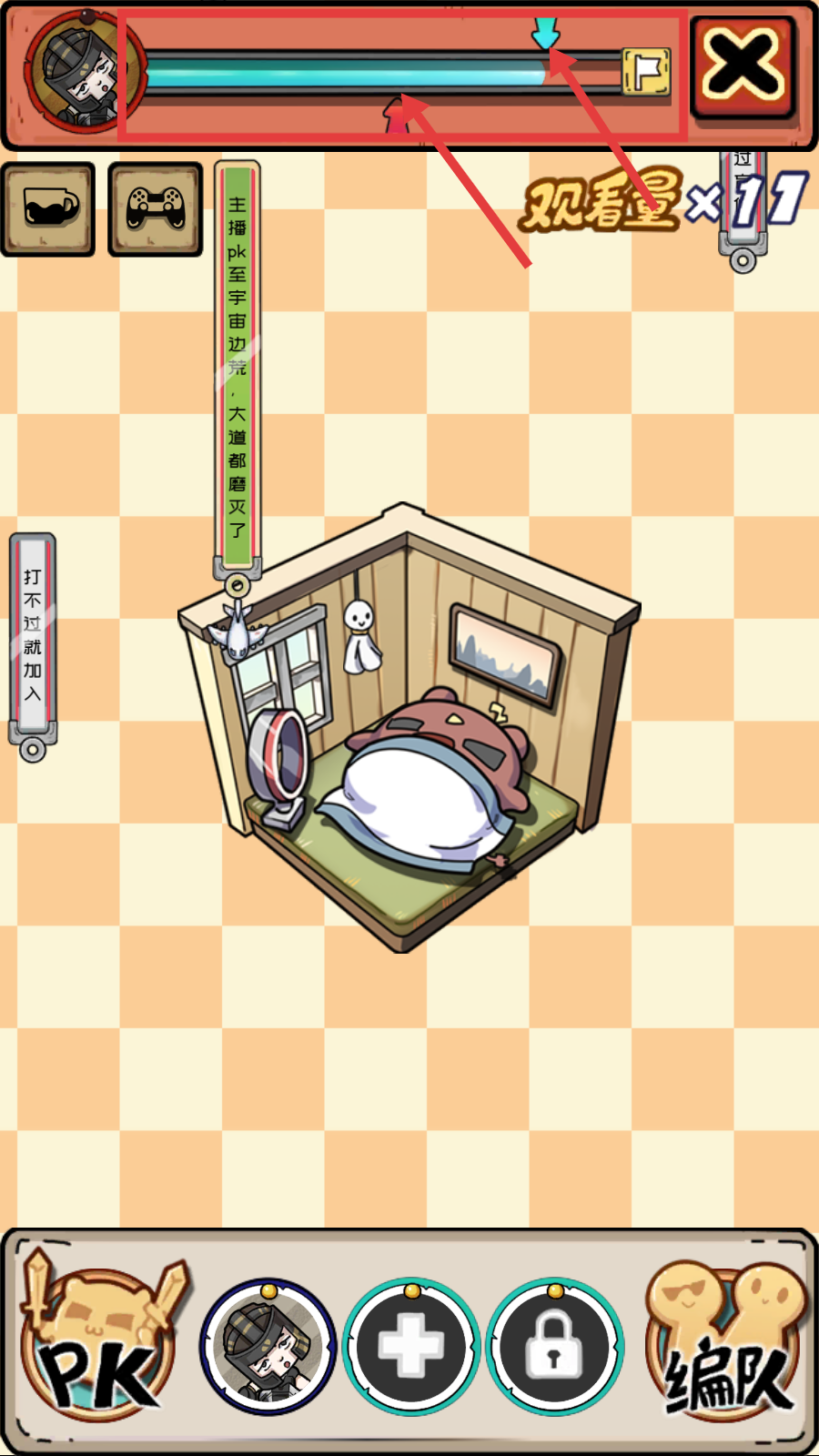 3、持续进行游戏操作,推动上方进度条前进,借助【观看量×11】的加成,加快进度条填充,向关卡目标迈进。