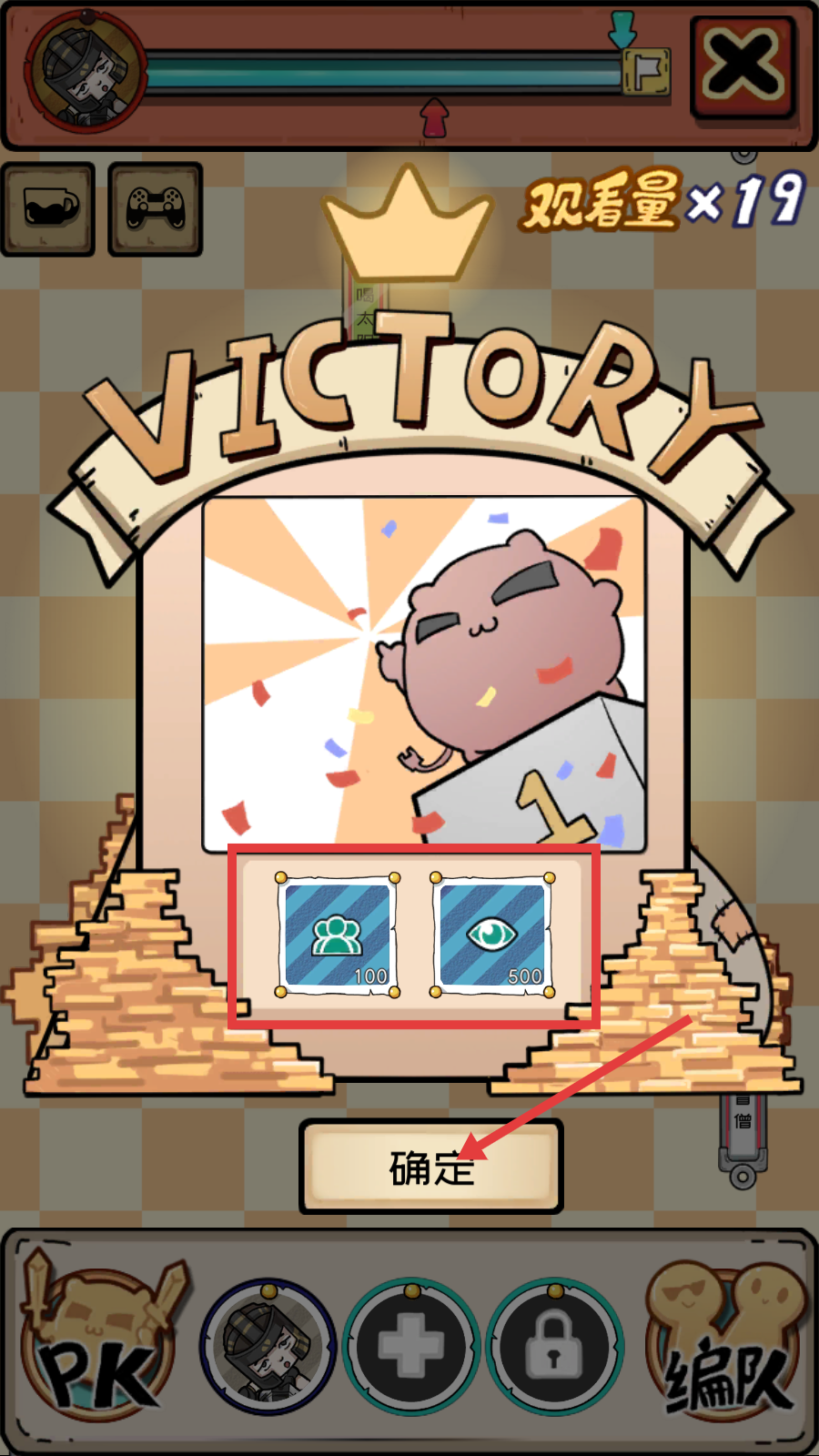 4、成功通关后,界面显示【VICTORY】,可获得【100】人脉、【500】观看量等奖励,点击【确定】领取奖励。