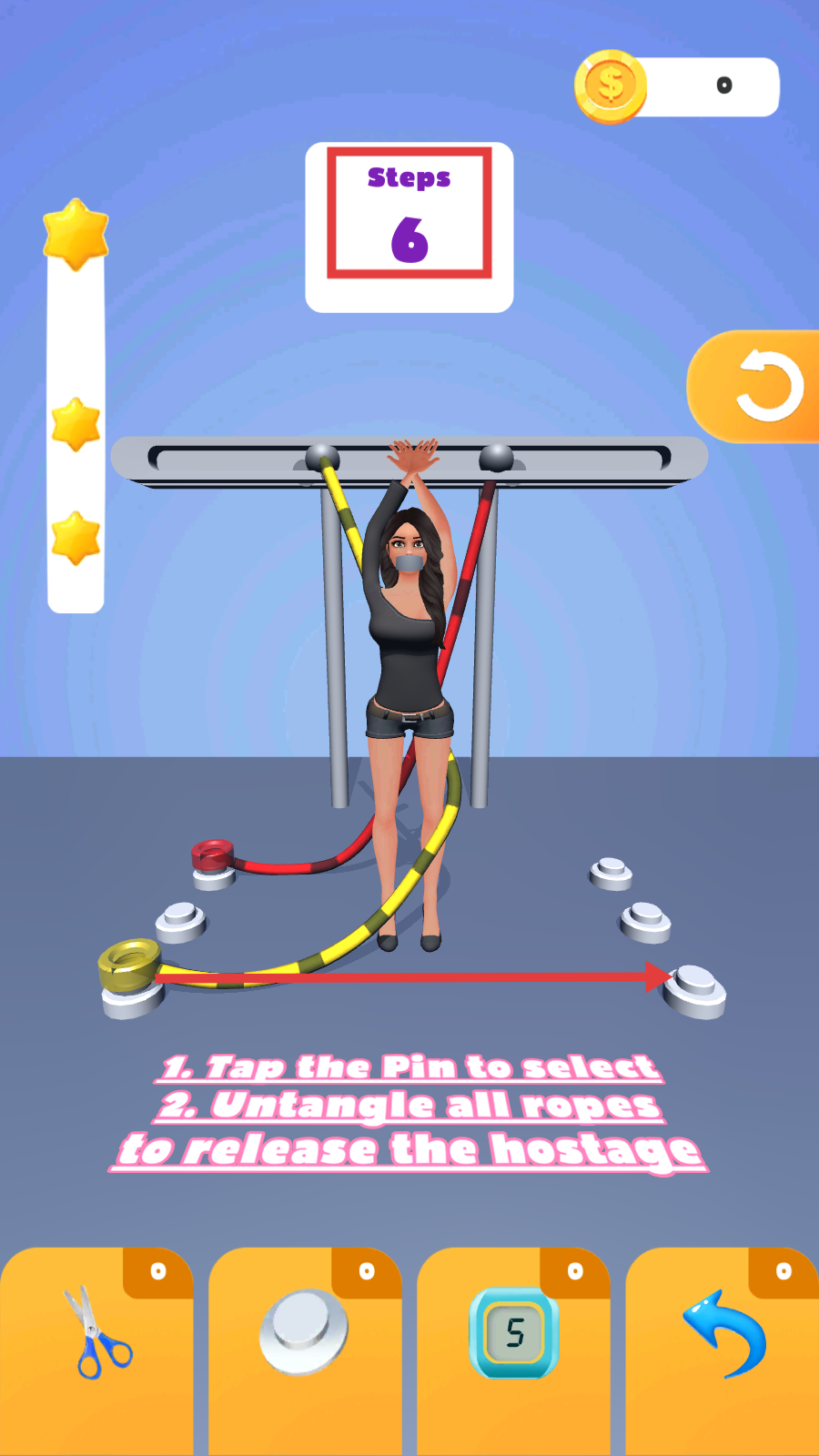 2、解谜时,可借助底部的【剪刀】【圆形道具】等工具,辅助选择pin,更高效地解开绳子,减少步骤数。