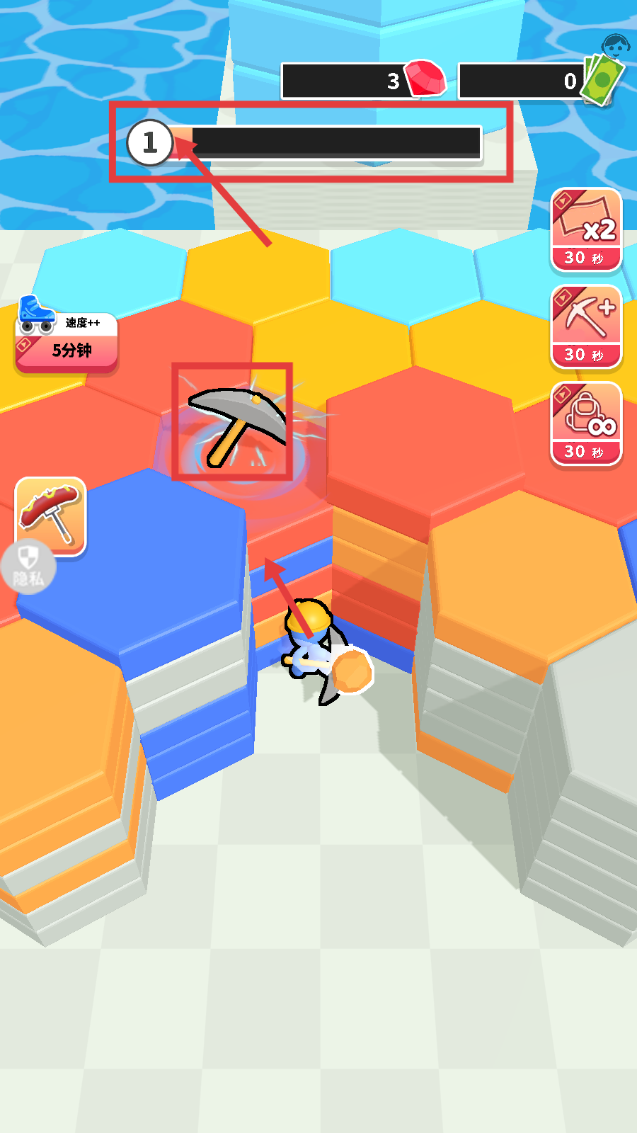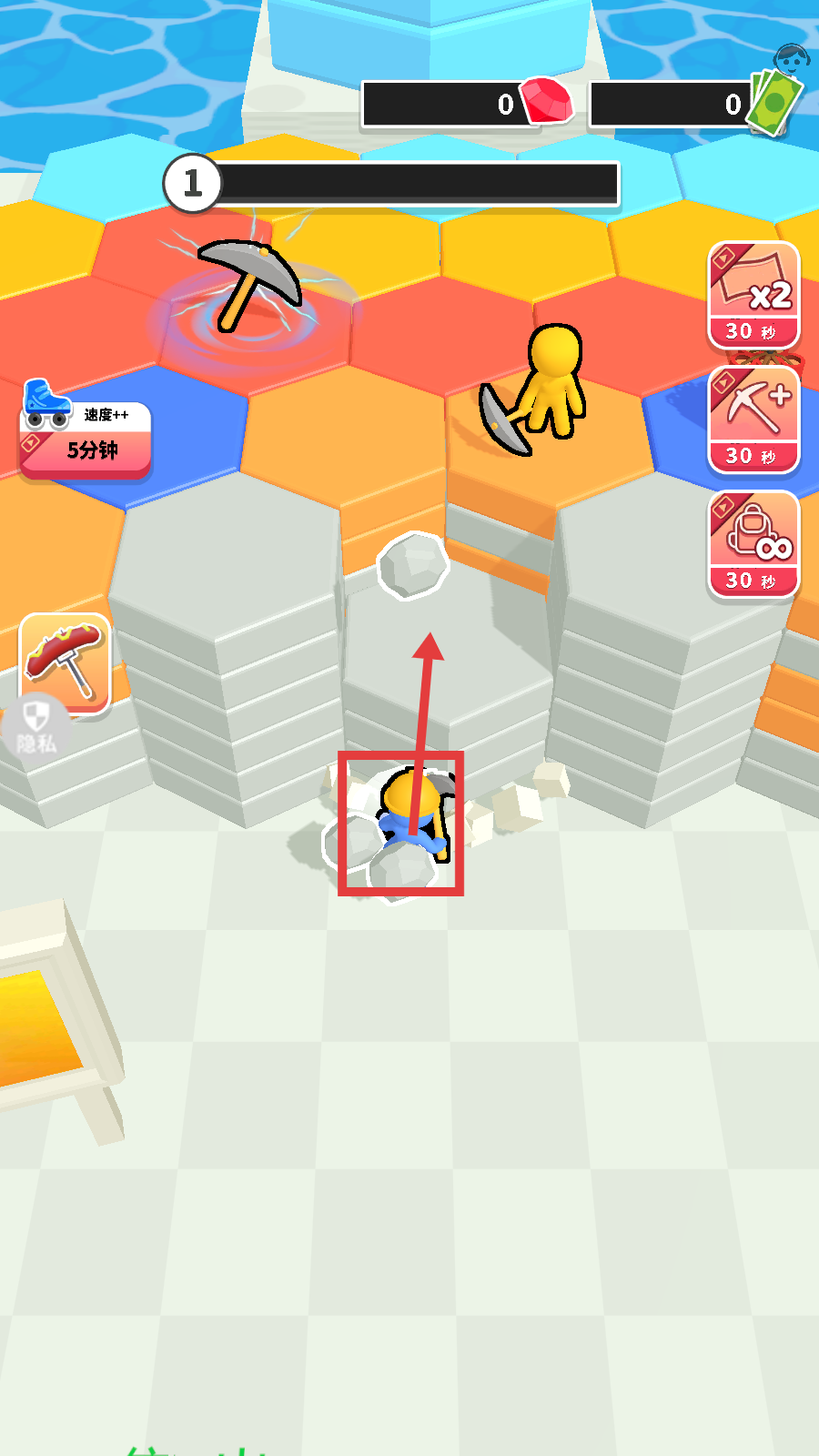 1、操控角色挥动工具挖矿,可借助左侧【速度++-5分钟】等道具,提升挖矿效率,推进等级进度。