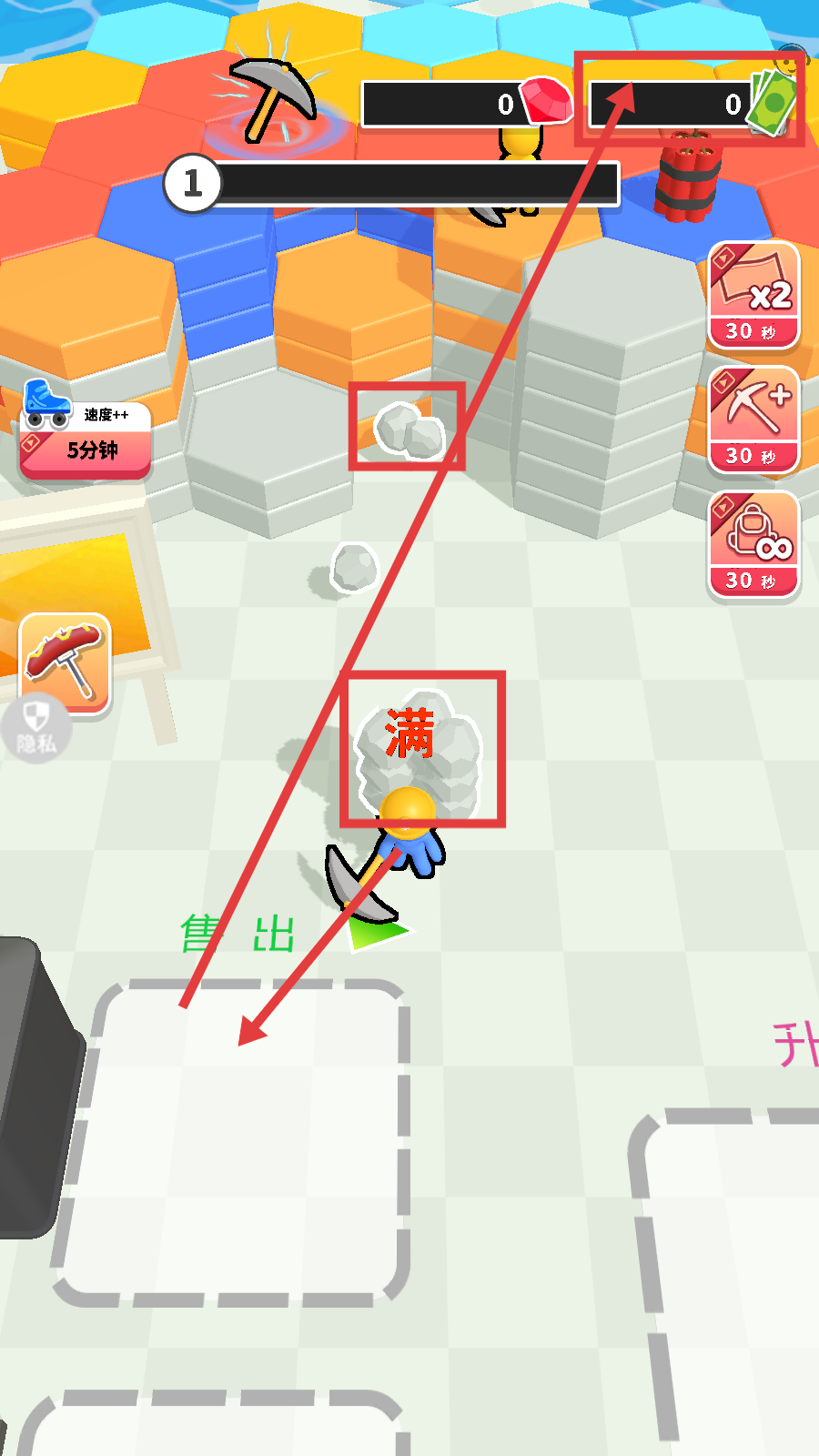2、当角色上方显示“满”时,及时前往“售出”区域,将矿石卖出,获取金钱资源。