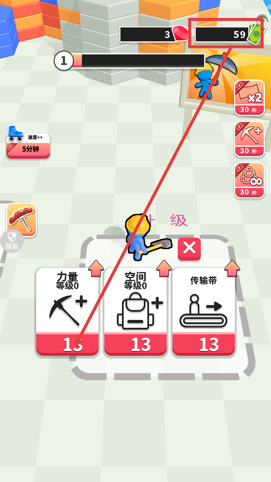3、利用获得的金钱,可升级【力量】【空间】【传输带】等属性,增强角色挖矿与运输等能力。