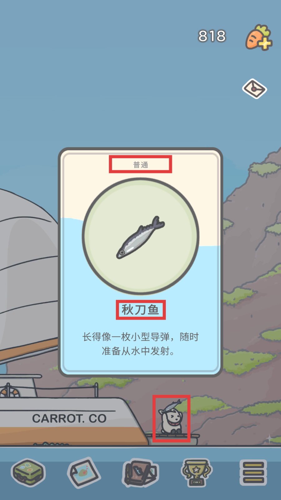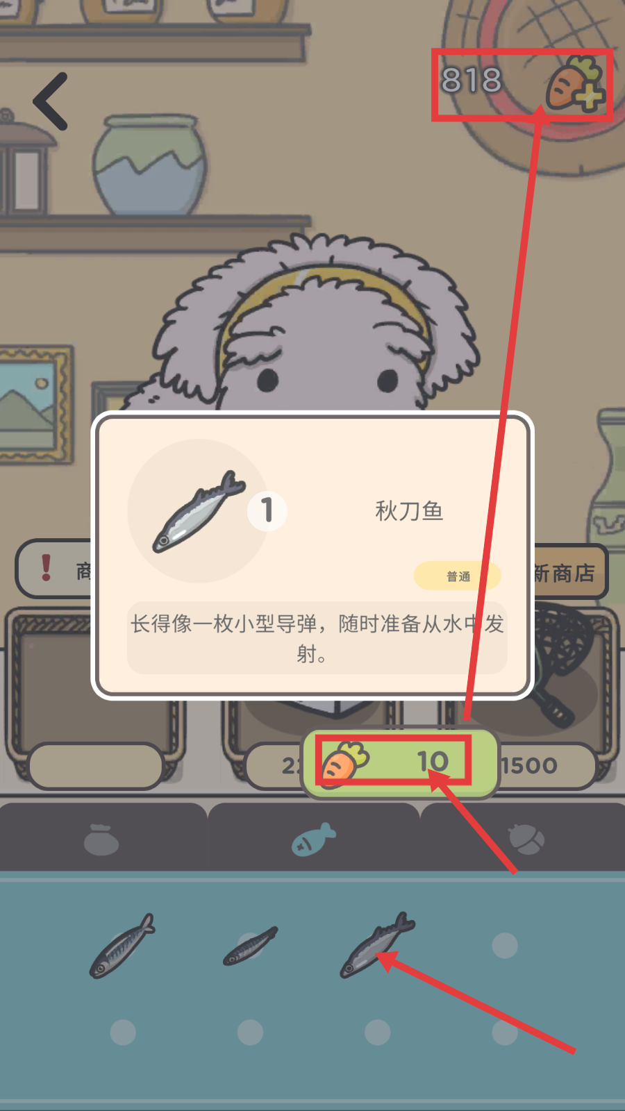 3、积累【胡萝卜】货币,贩卖秋刀鱼可获得10个胡萝卜,多收集胡萝卜为后续兑换道具做准备。