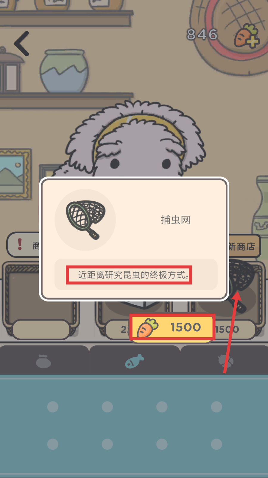 4、当胡萝卜数量足够时,花费1500个胡萝卜购买【捕虫网】,它是近距离研究昆虫的实用工具。