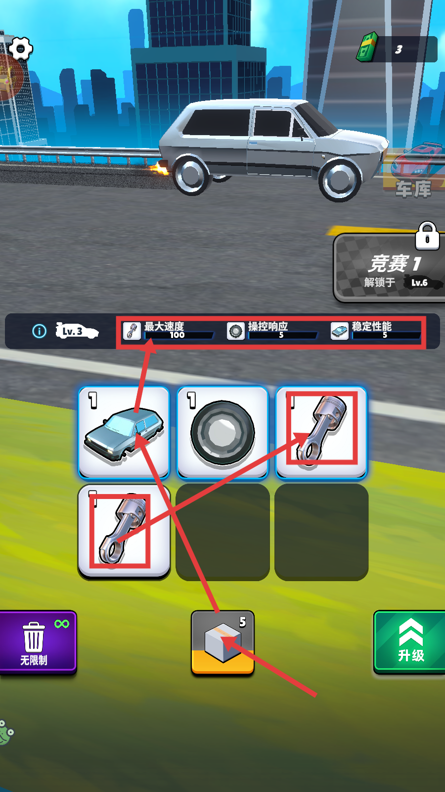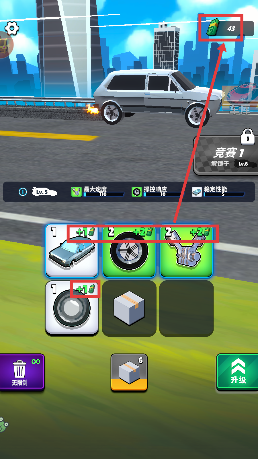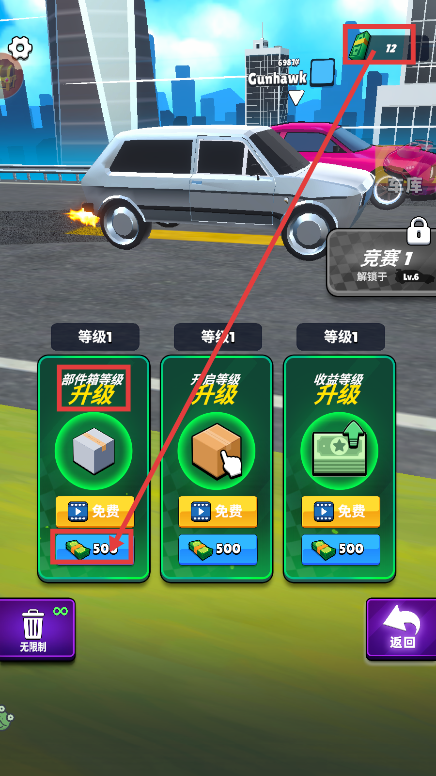 4、花费500金钱可进行【部件箱等级升级】,还能解锁【开启等级升级】【收益等级升级】,强化车辆与资源获取效率。