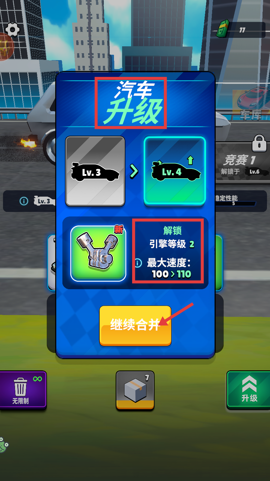 2、点击【继续合并】进行汽车升级,合并部件能解锁更高引擎等级,让汽车【最大速度】从100提升至110,增强行驶性能。
