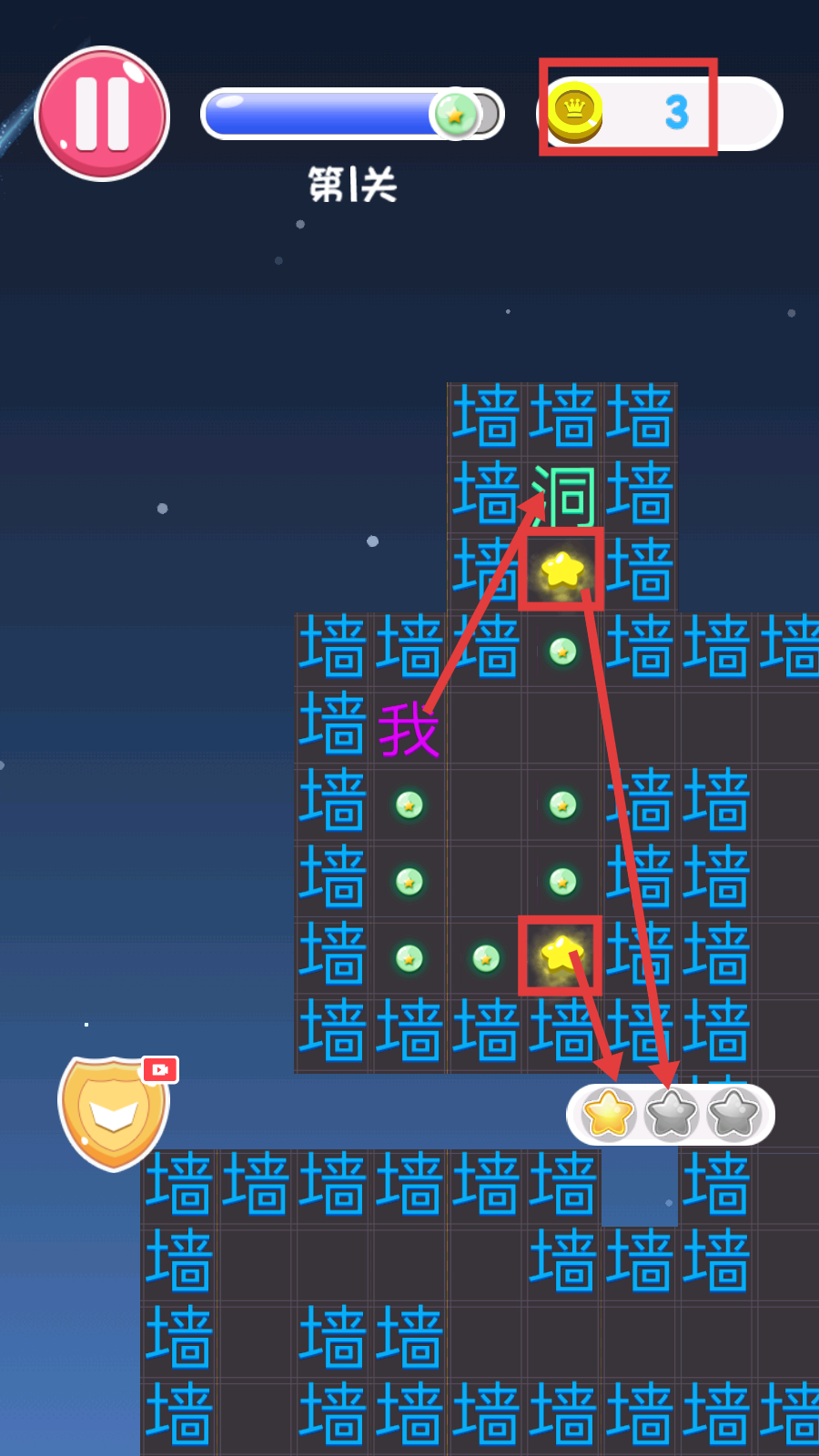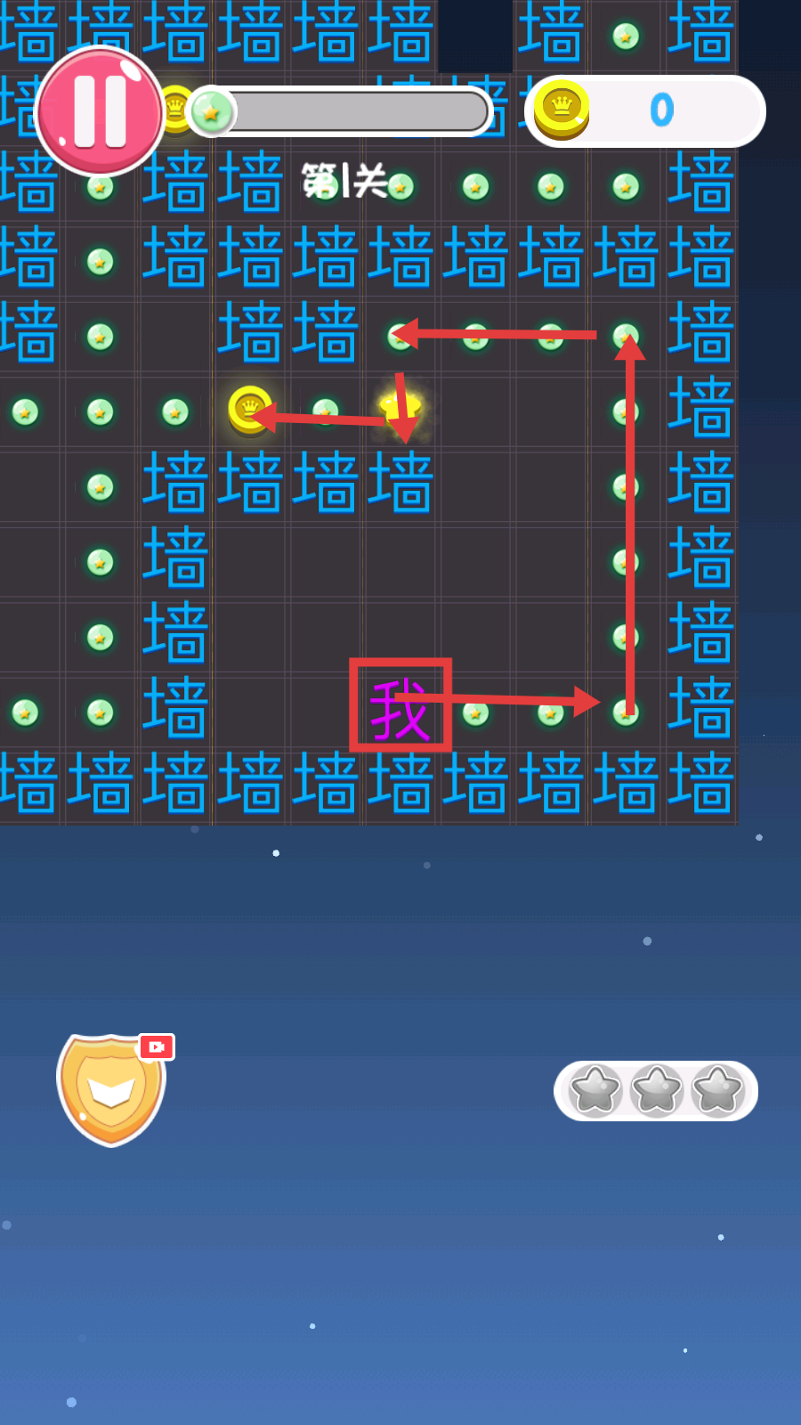 2、在第1关,操控“我”移动,避开【墙】的阻挡,收集黄色金币与星星,推进关卡进度。