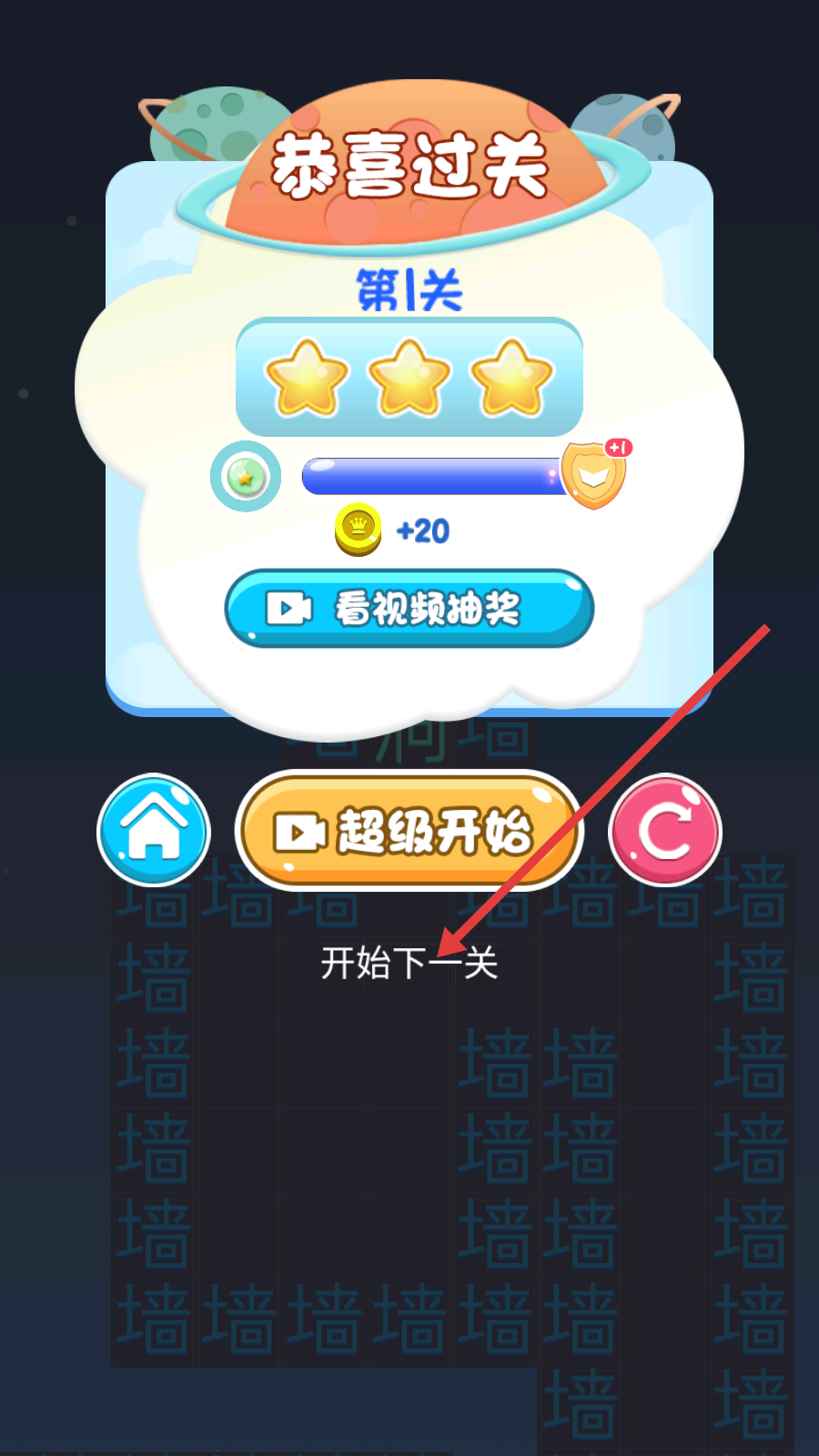 4、通关第1关后,界面显示【恭喜过关】三星评价,点击“开始下一关”,继续后续关卡挑战。