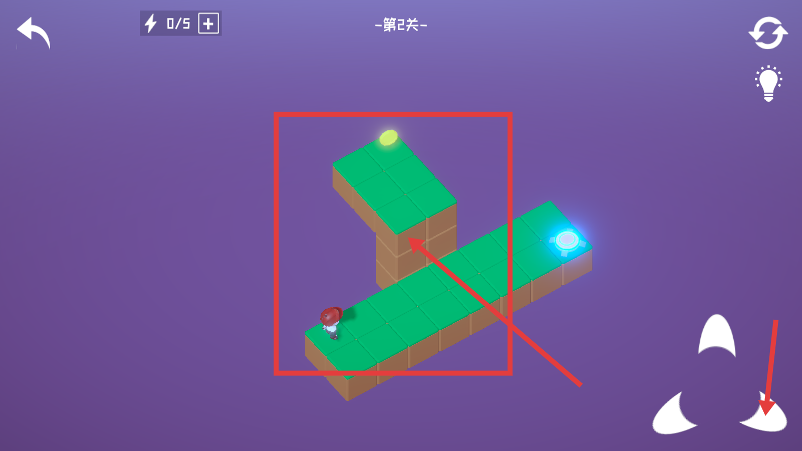 2、在-第2关-中,操控角色在绿色方块路径移动,观察金币处于什么位置,点击右下角的按键改变地形。