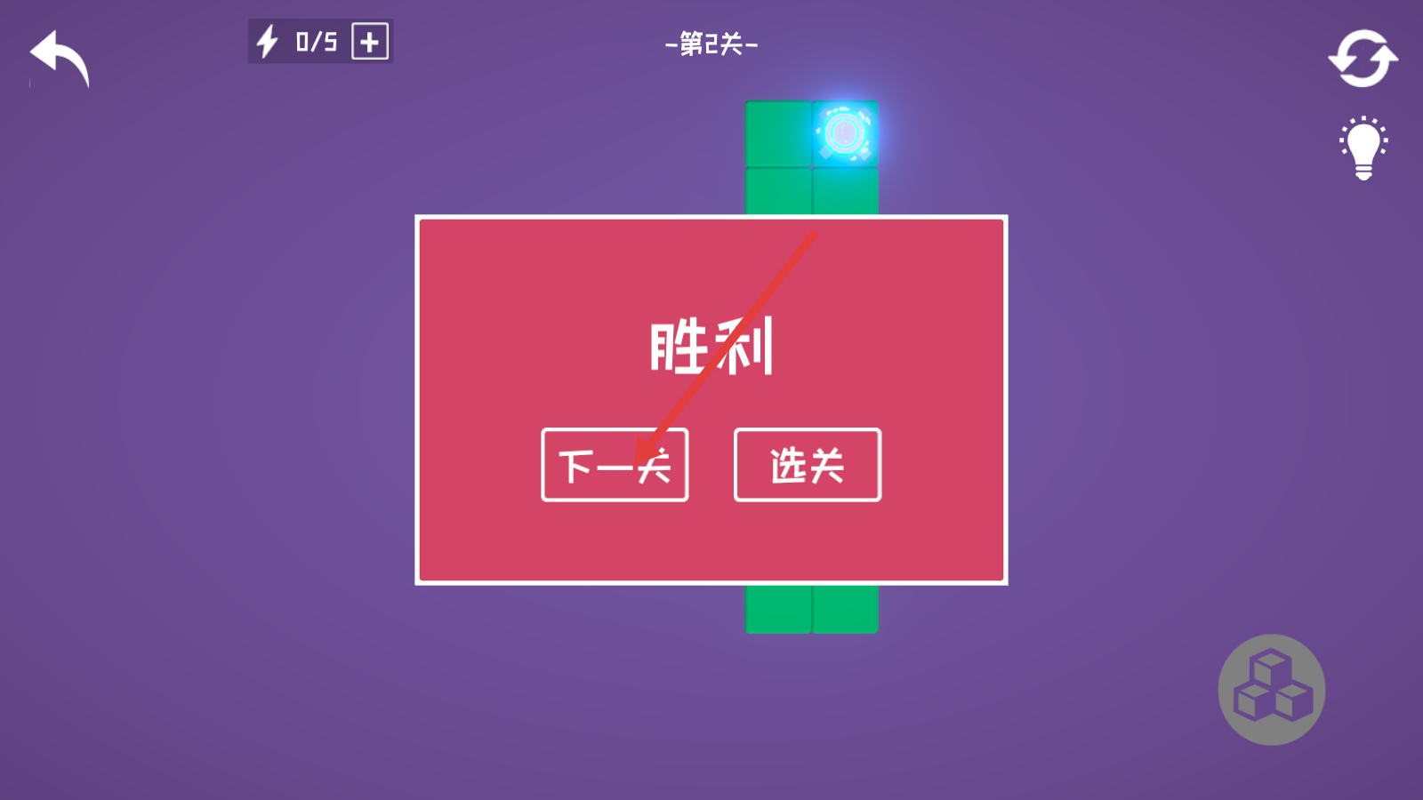 4、成功到达蓝色传送点后,界面显示【胜利】,点击【下一关】继续后续挑战。