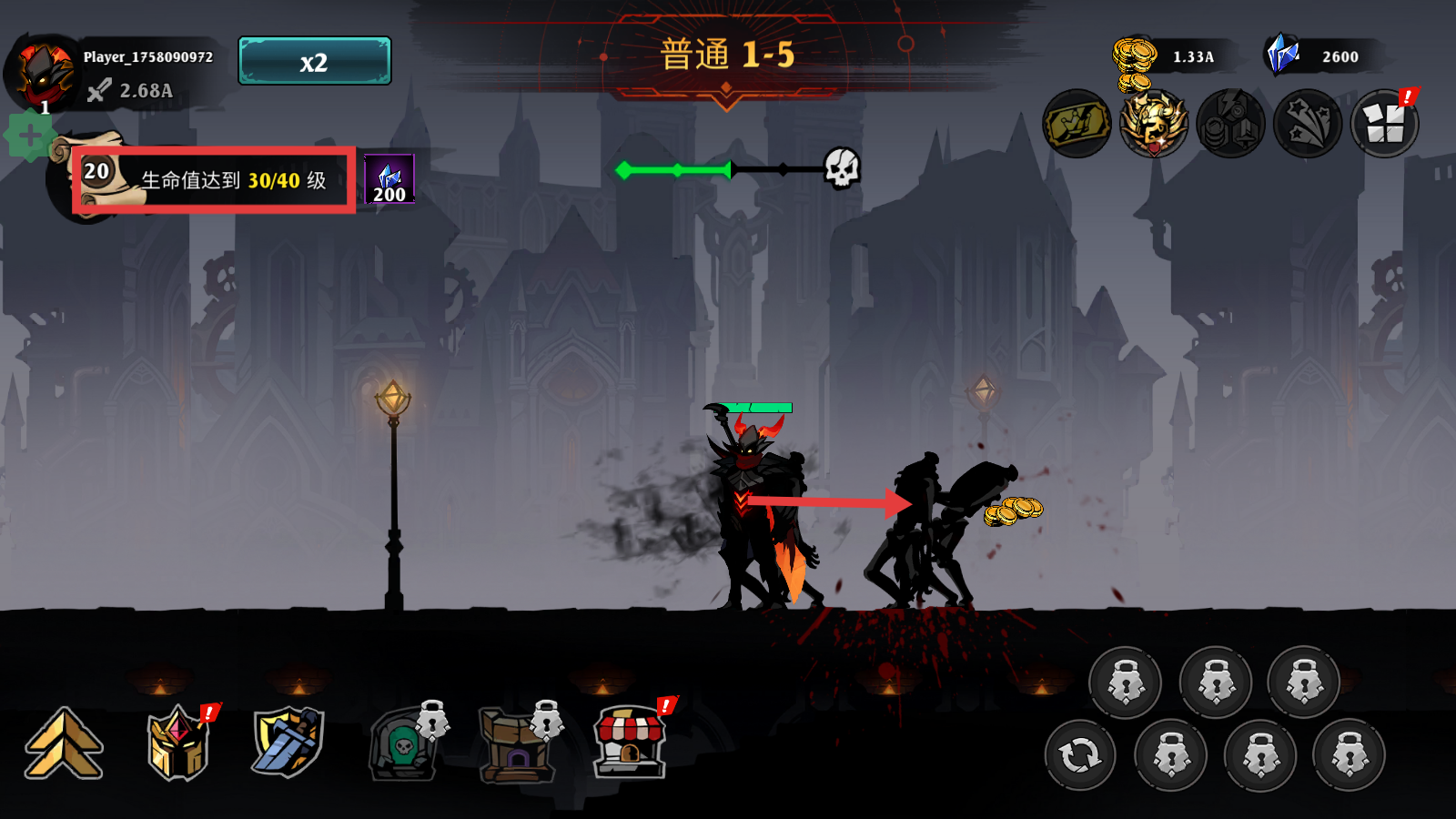 1、在【普通1-5】关卡战斗时,留意【生命值达到30/40级】的任务进度,持续攻击敌人推进关卡进程。