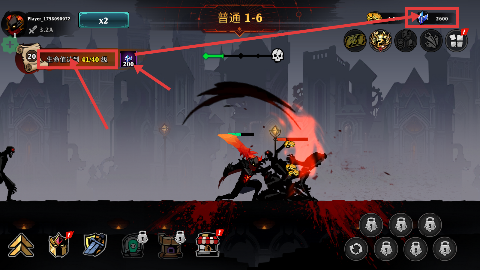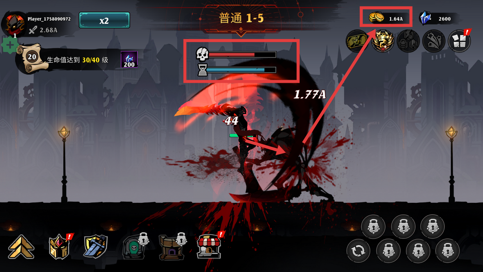 2、战斗中关注敌人的骷髅血条与沙漏时间条,成功击败敌人可获取【1.64A】金币,积累资源。