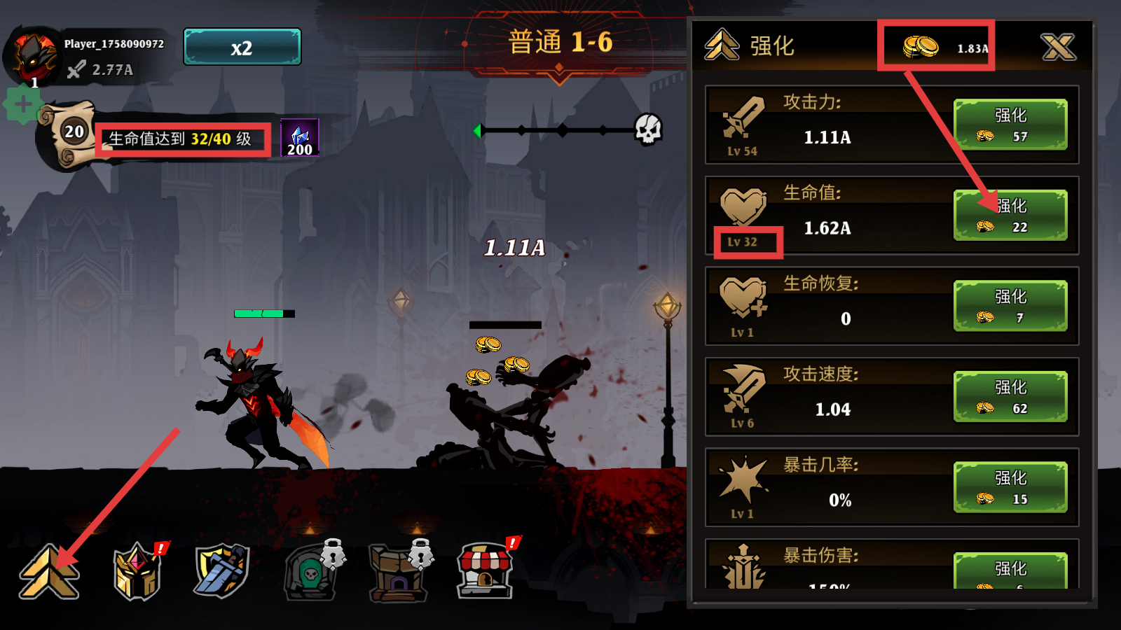 3、点击左下角强化类图标,进入强化界面,消耗【1.83A】金币强化【生命值-Lv32】等属性,提升至40级。