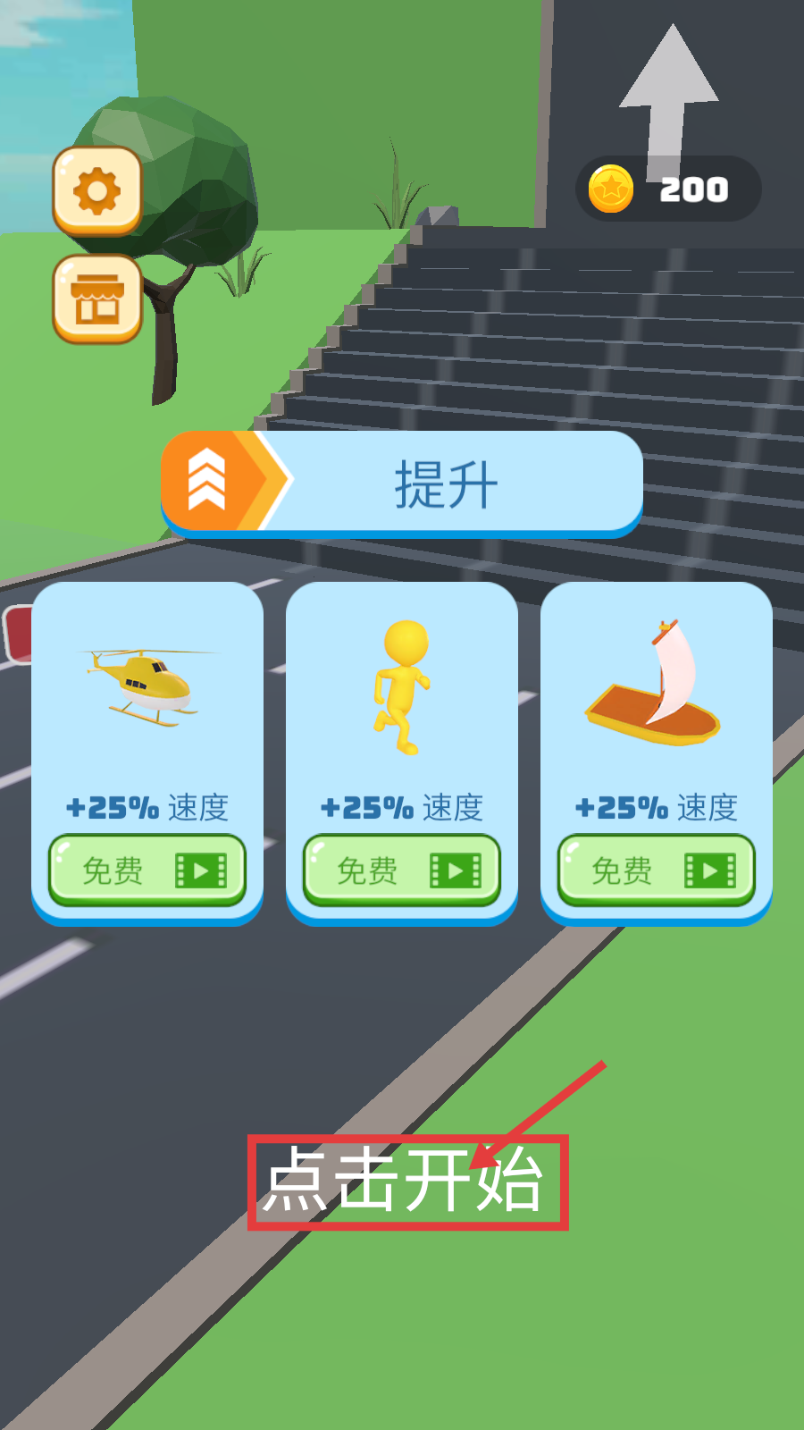 1、点击【点击开始】进入游戏,可先查看【直升机-+25%速度】等提升选项,选后开启关卡挑战。
