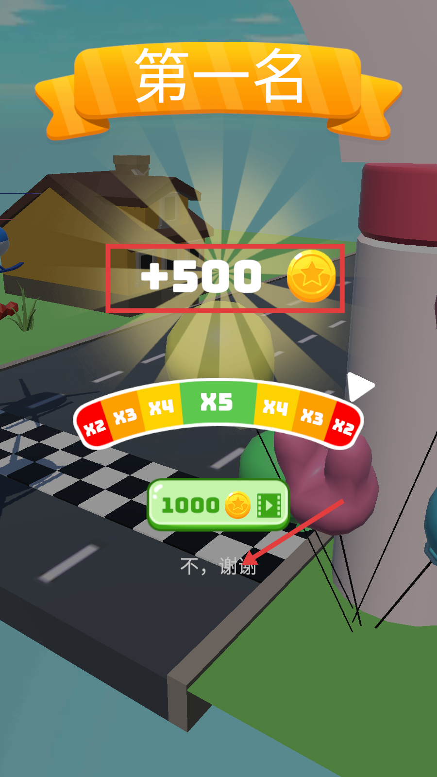 4、顺利抵达终点获【第一名】,可领【+500】金币奖励,不想看广告点击【不,谢谢】结束结算。