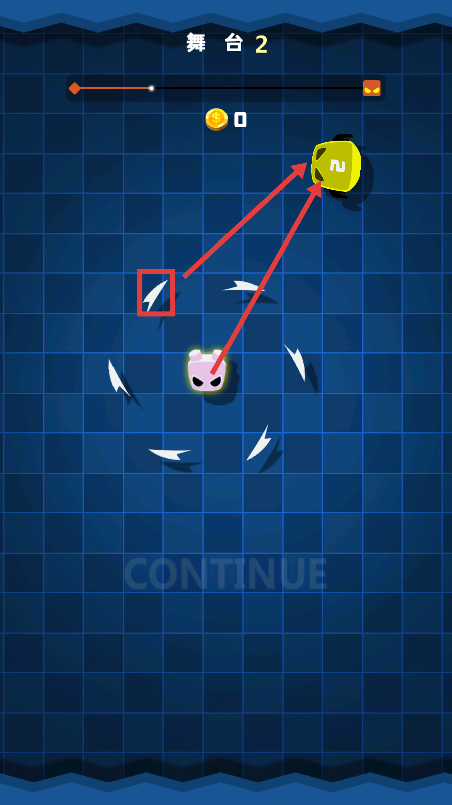 2、进入【舞台2】,操控角色发射飞刀,瞄准黄色怪物进行攻击,推进关卡进程。