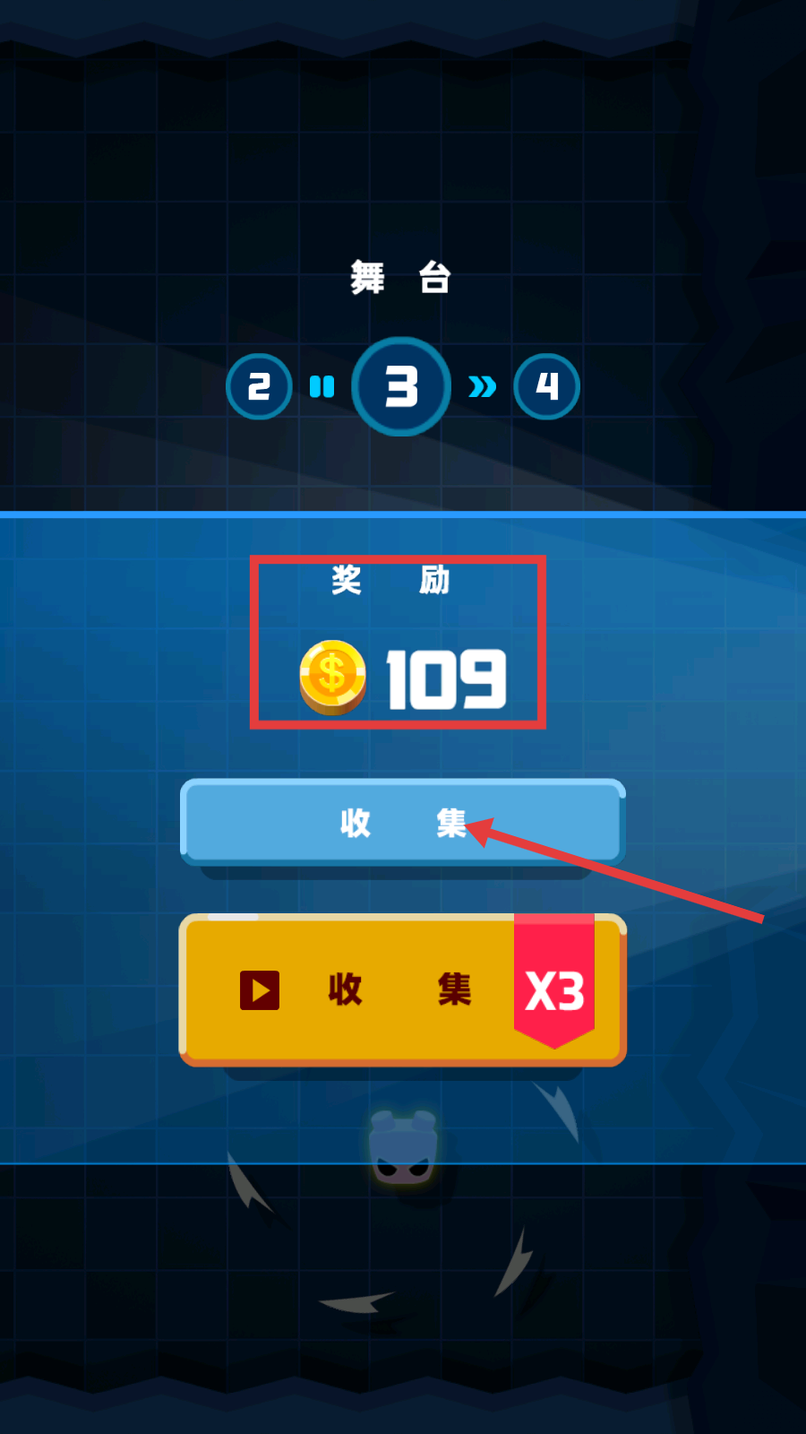4、关卡结束后,界面显示奖励【109】金币,点击【收集】按钮领取奖励,继续挑战后续关卡。