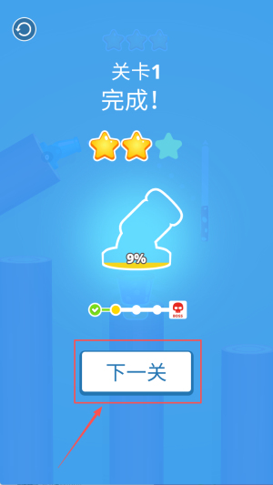 4、如何进入下一关?击败20名敌人后出现“完成!9%”,点击“下一关”继续挑战。
