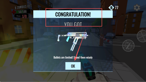 4、如何领取胜利?剩余僵尸归零弹出“CONGRATULATION!”,点击“OK”领取奖励并进入下一关。